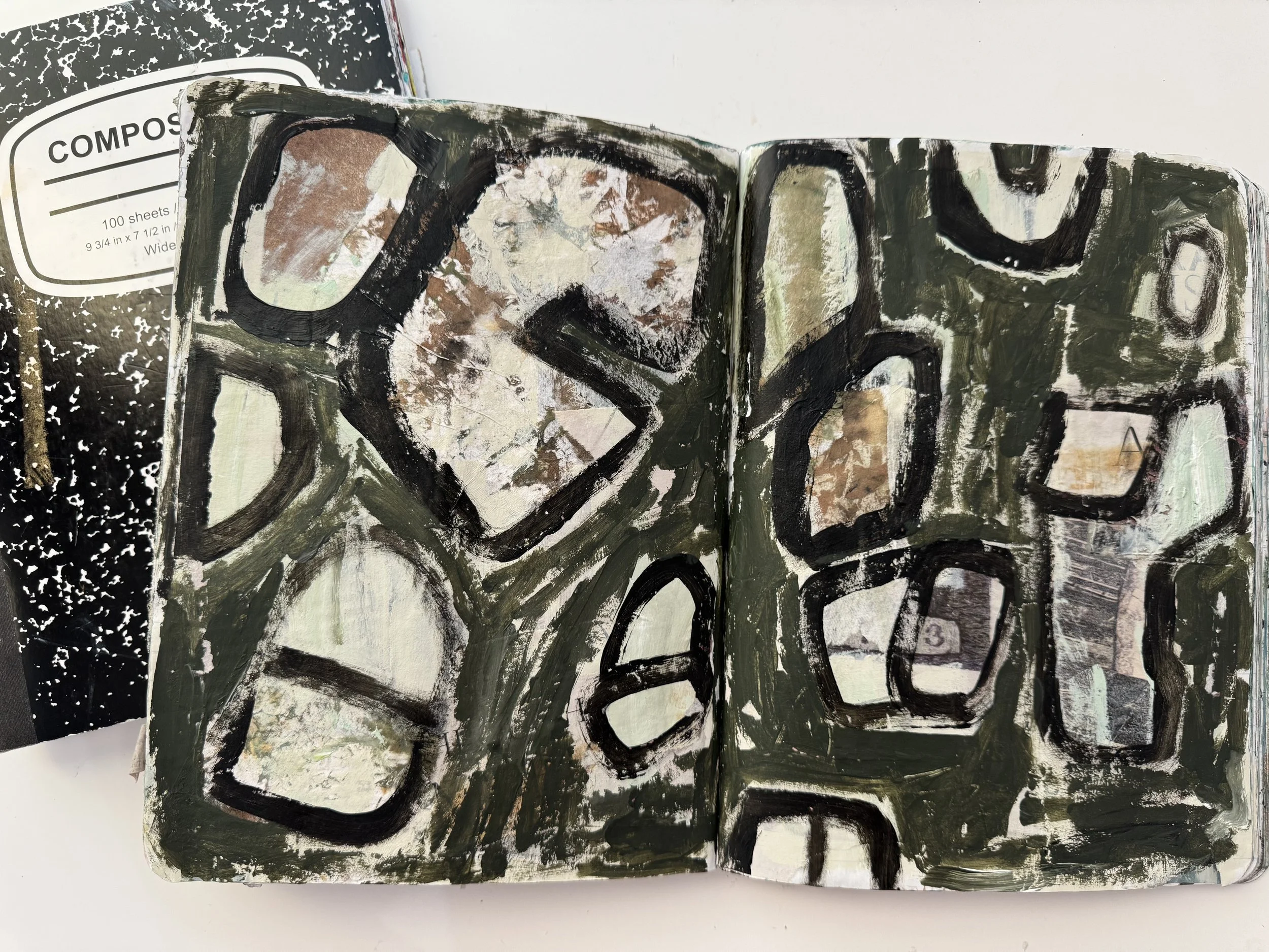A composition notebook can hold a surprising amount of media. I use them for mark making, taking notes, working through specific studies, and keeping related ideas together. Because they’re inexpensive, there’s freedom to experiment. Pages can be torn out and reused as collage material, which keeps the work in circulation rather than locked in a book.